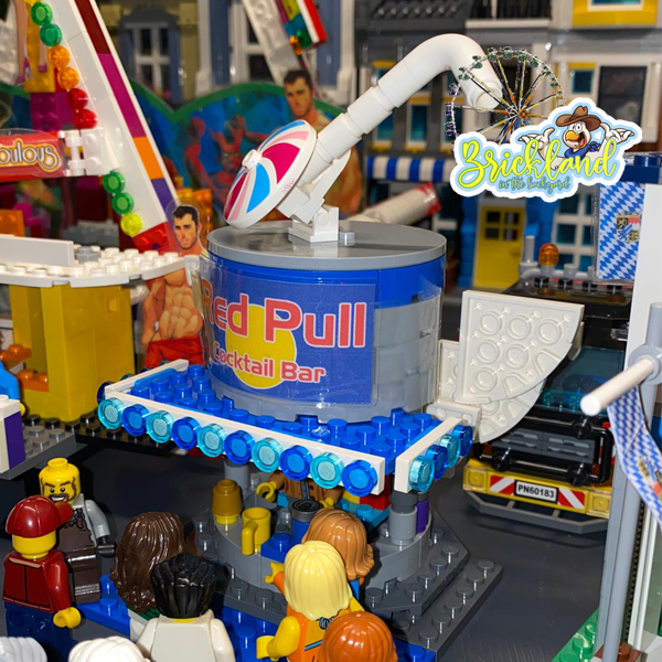 Ganz im Stil der vielseits bekannten Marke kommt diese Kirmesbude daher. Als Dose getarnt, versteckt sich in ihr eine kleine Bar, die Cocktails nach Wünschen deiner Mini-Figures zaubert. Die übergroße Dose wird durch einen ebenfalls übergroßen Trinkhalm und einem Schirmchen auf dem Dach verziert.